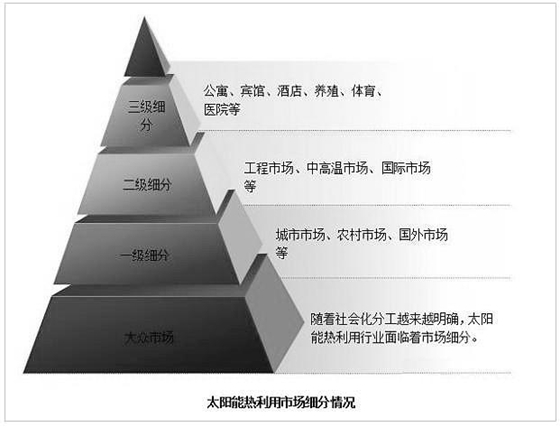 受国家能源政策的推动,太阳能利用有着无比广阔的前景,国内市场客户群体庞大。经过认真分析判断,我们决定,仍将继续把工作重心放在太阳能集热应用方面。集热应用领域内的客户市场细分如下: